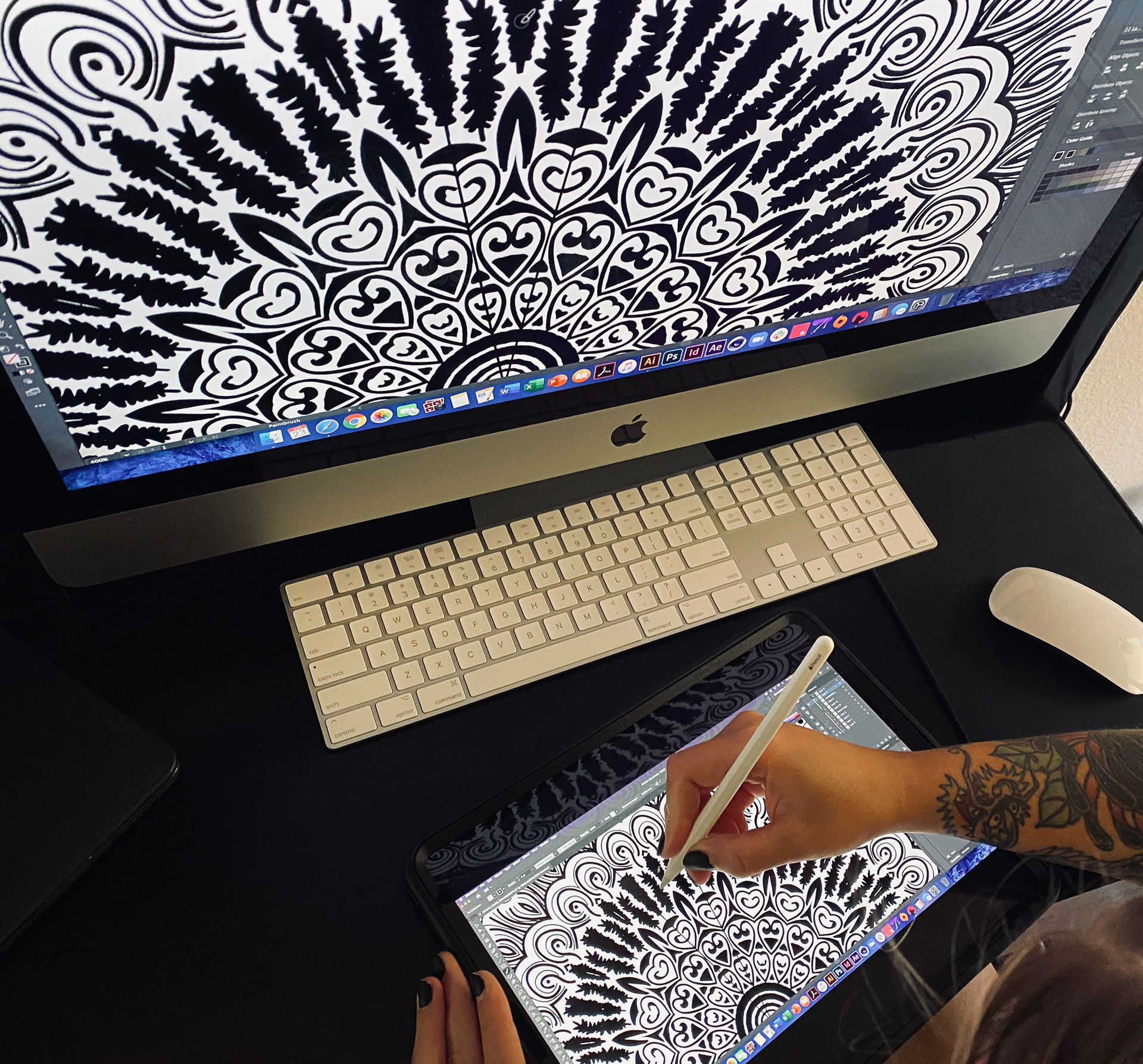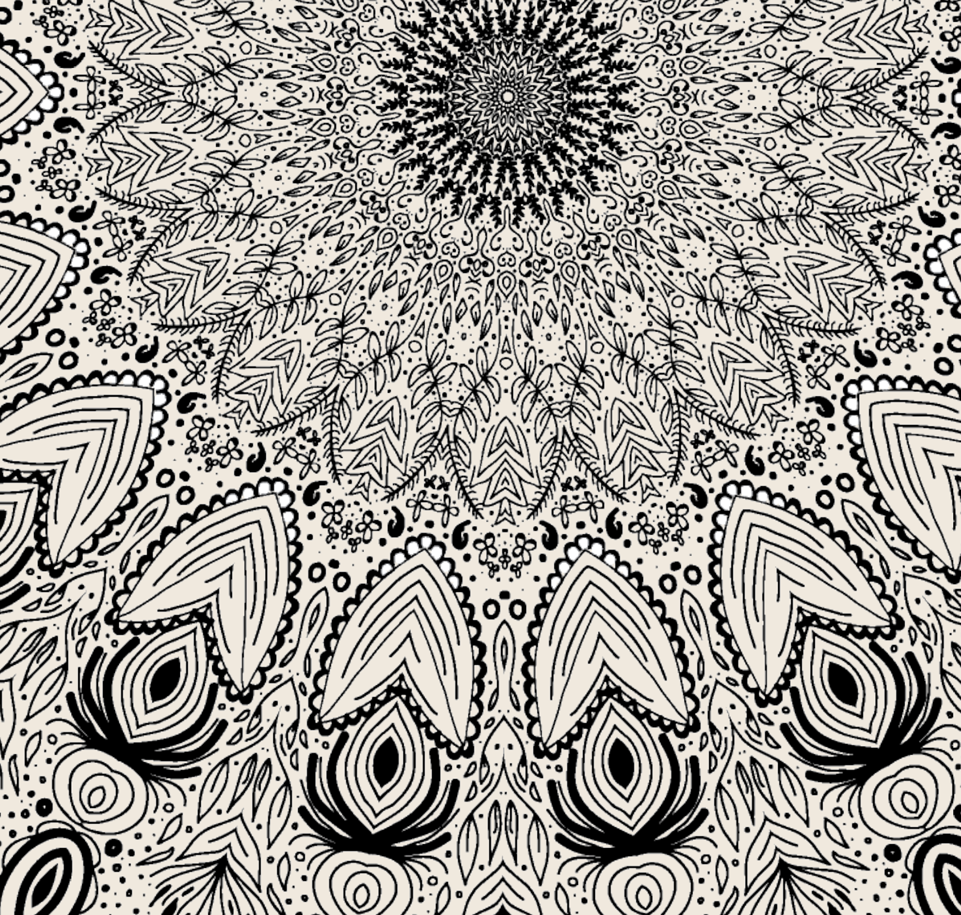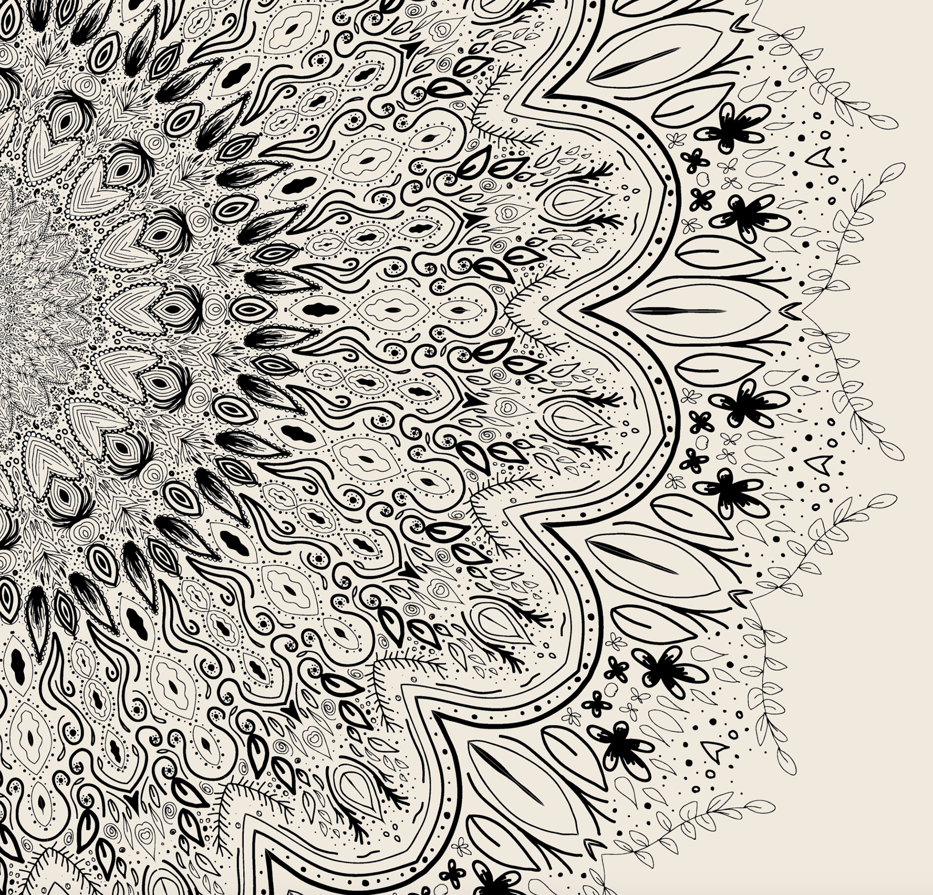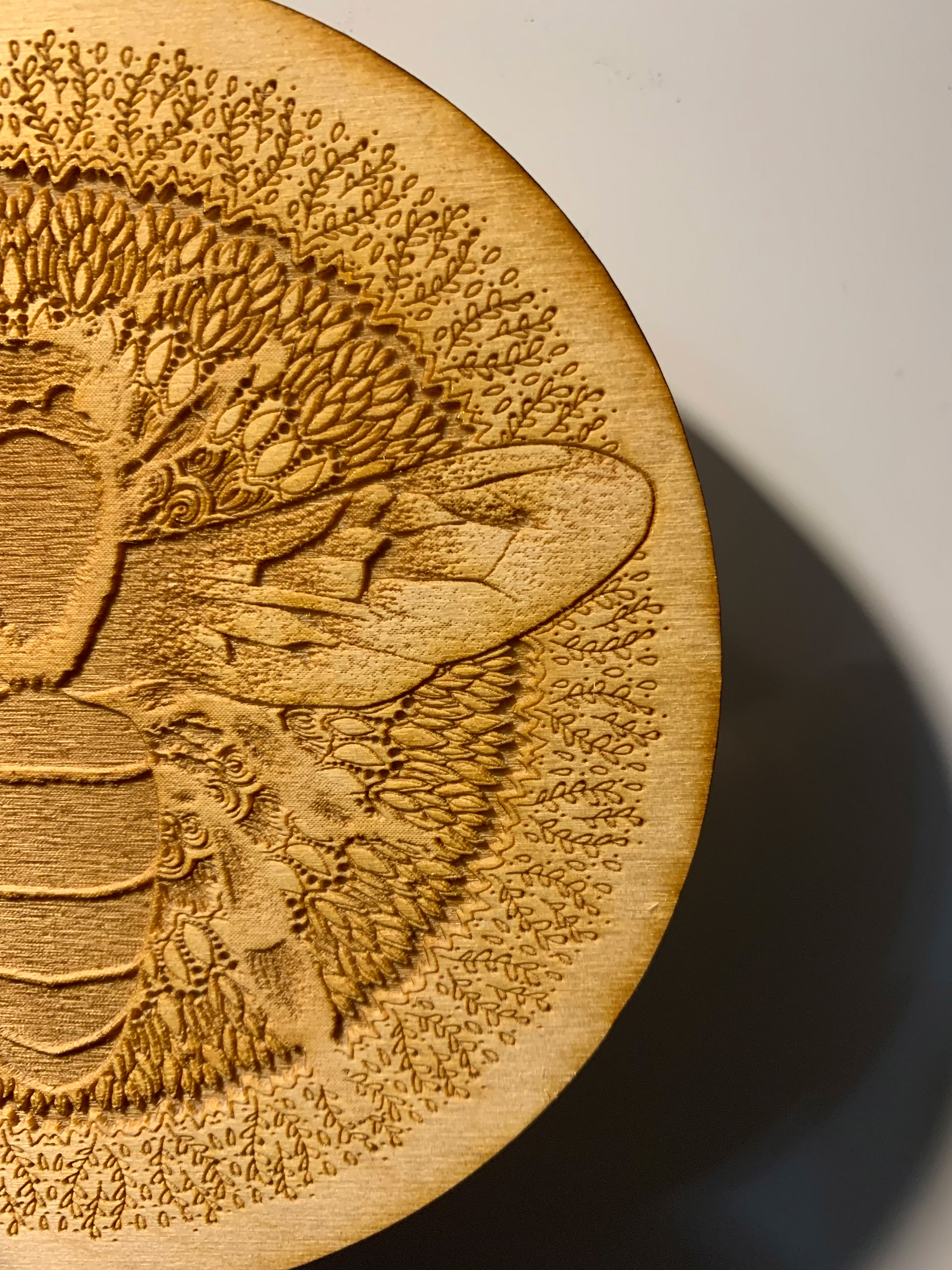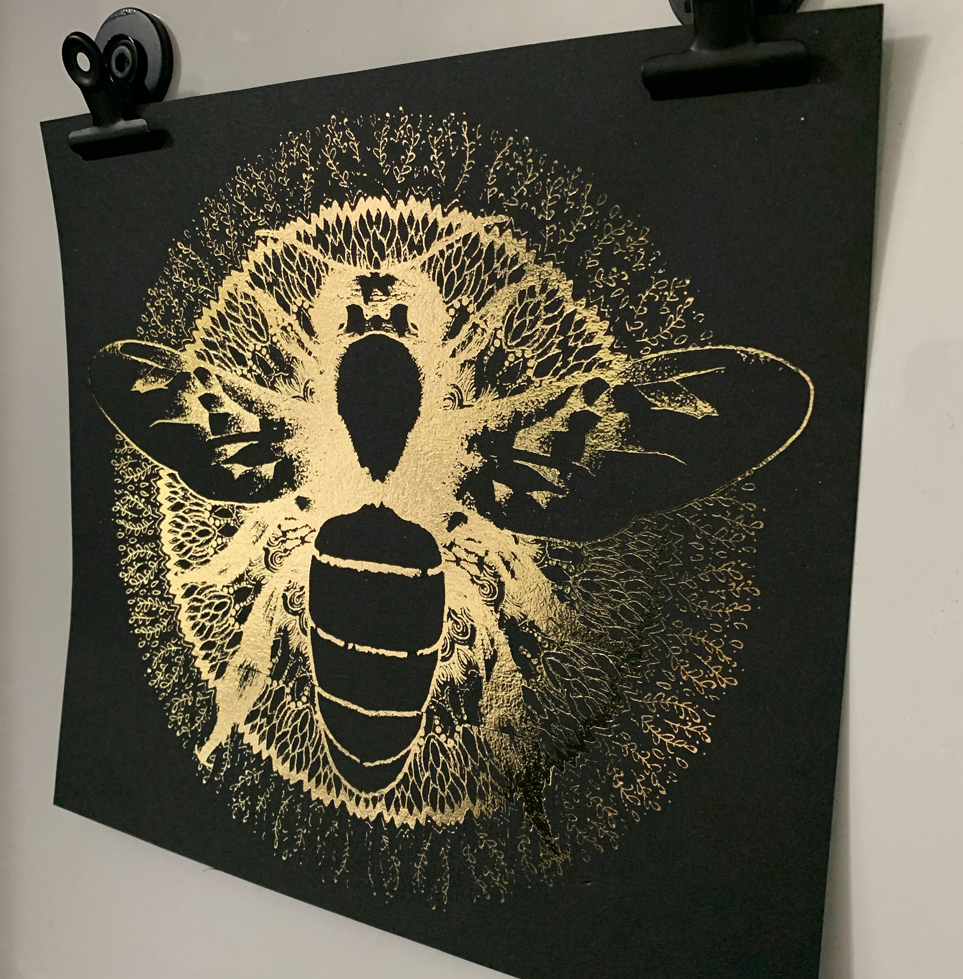 A hand-drawn bee illustration that incorporates symmetrical line art. The bee and the mandalas were altered and applied to plywood, bamboo, and craft paper with reflective material.